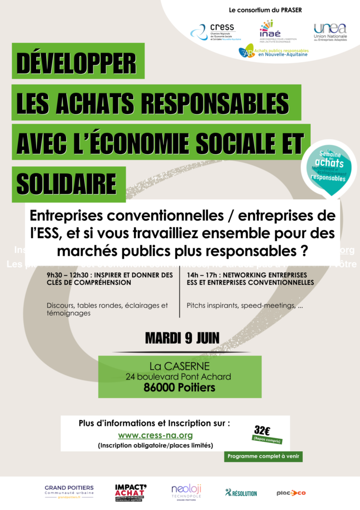 Suite à la réussite de la journée « Développer les achats responsables avec l’ESS » de 2025, le consortium du PRASER (Parcours Régional des Achats Socialement et Écologiquement Responsables), composé de la CRESS Nouvelle-Aquitaine, INAE, 3AR et  UNEA, organise deux événements dans le cadre de la Semaine des achats socialement et écologiquement responsables (du 08 au 12 juin).