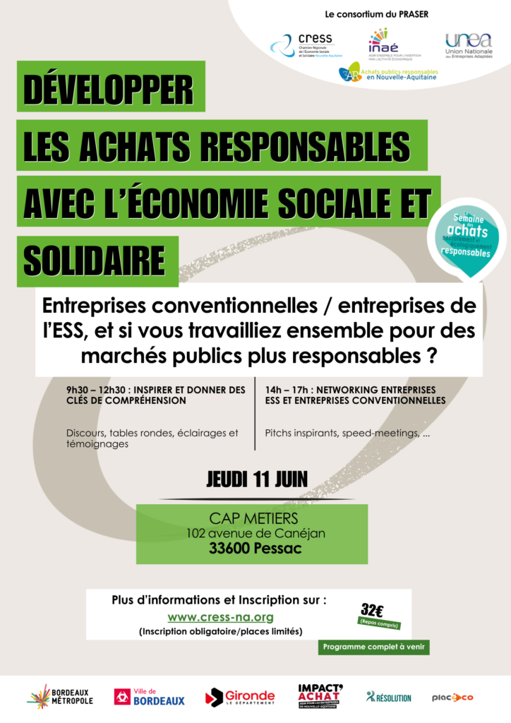 Suite à la réussite de la journée « Développer les achats responsables avec l’ESS » de 2025, le consortium du PRASER (Parcours Régional des Achats Socialement et Écologiquement Responsables), composé de la CRESS Nouvelle-Aquitaine, INAE, 3AR et UNEA, organise deux événements dans le cadre de la Semaine des achats socialement et écologiquement responsables (du 08 au 12 juin).