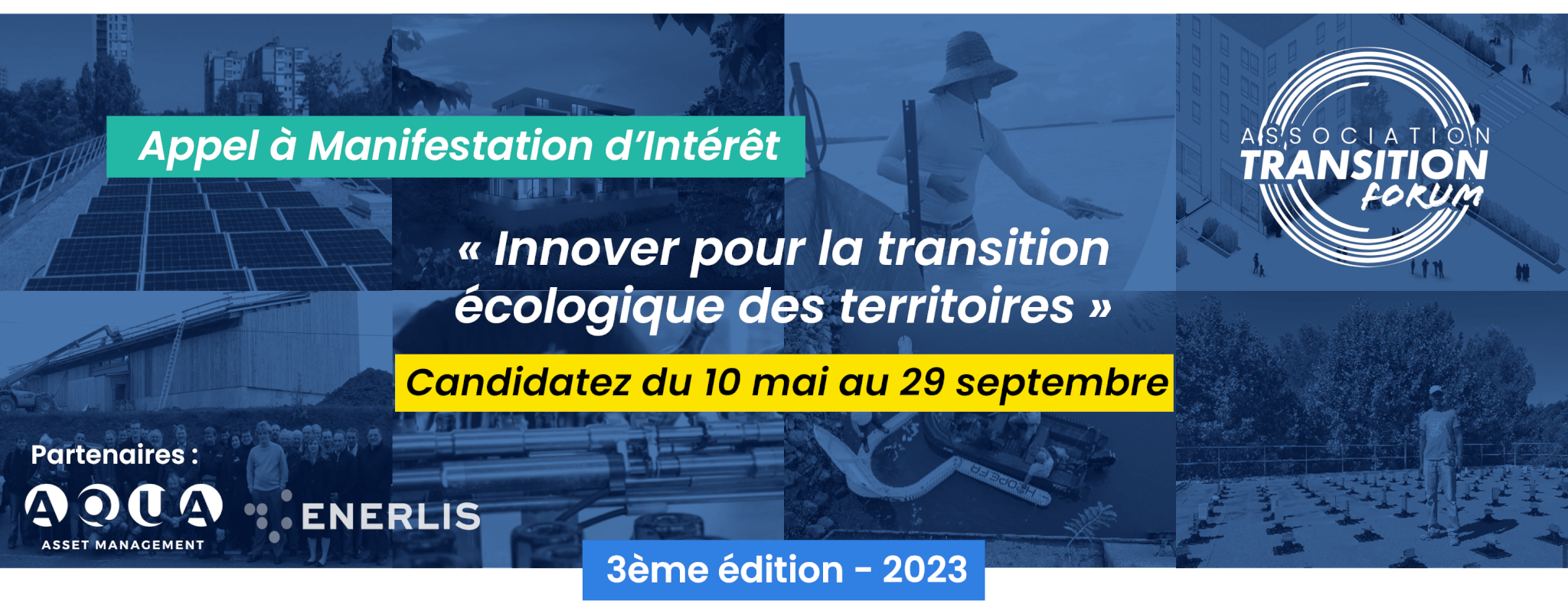 Porté par l’Association Transition Forum, cet AMI, en partenariat avec Enerlis et la société de gestion Aqua Asset Management, a pour but d’identifier des projets de transition écologique innovants, réplicables et ancrés dans les territoires – en 2022, une centaine de projets ont ainsi été reçus. Les cinq projets les plus inspirants et exemplaires bénéficieront d’une campagne de valorisation, auprès d’une communauté de plus 15000 décideurs publics et privés, ainsi que d’un accompagnement et de mises en relation.