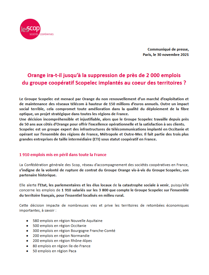 Orange ira-t-il jusqu’à la suppression de près de 2 000 emplois du groupe coopératif Scopelec implantés au coeur des territoires ?